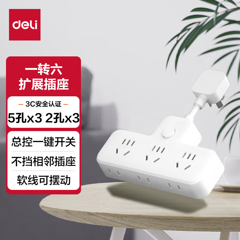 得力(deli)柔性插座转换器 转换插头 品字形扩展插座/插板/排插/插排 一转多插座 总控一转六 LU5004