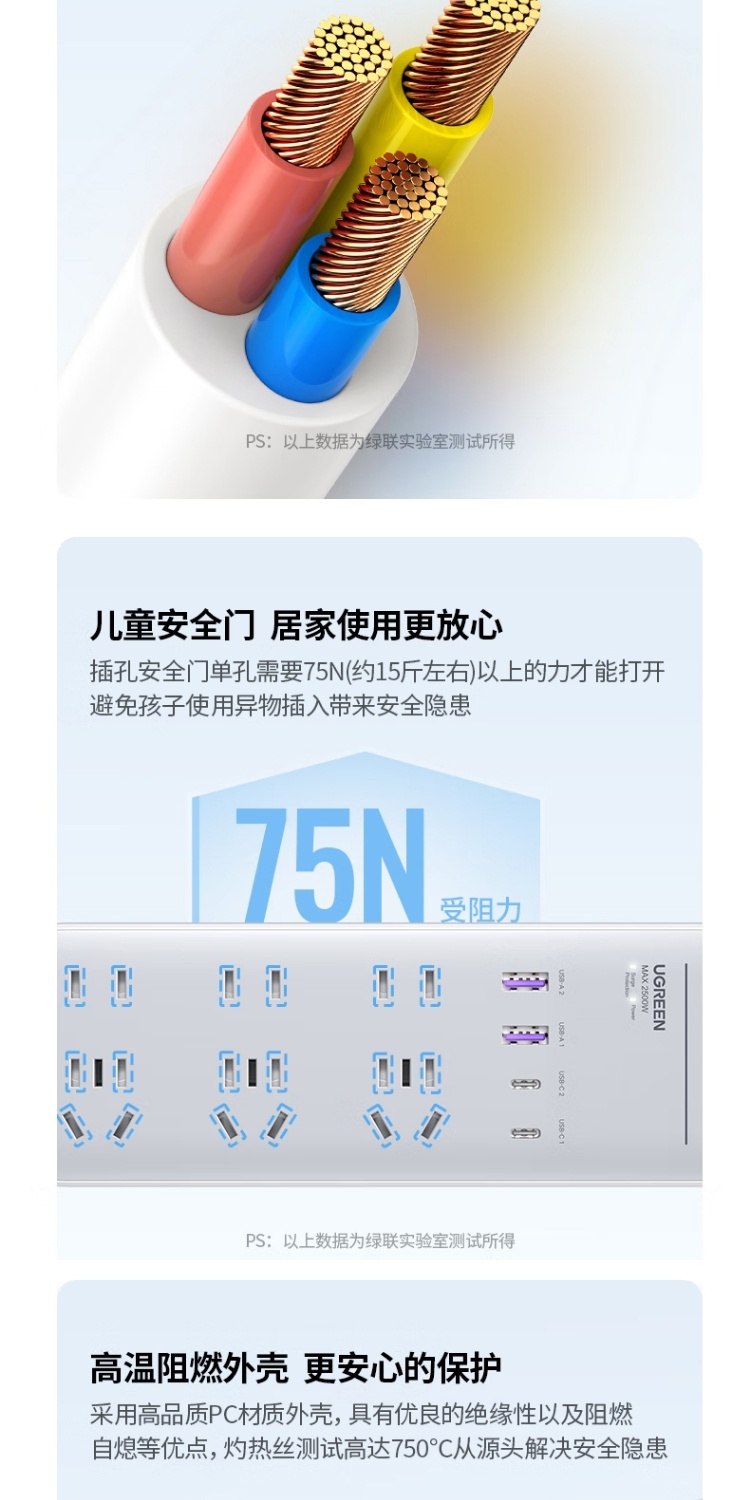 商品名称:绿联 90473 65W氮化镓PD快充Type-C+USB插座/插线板/排插/接线板/拖线板 适用笔记本苹果13/14华为手机
