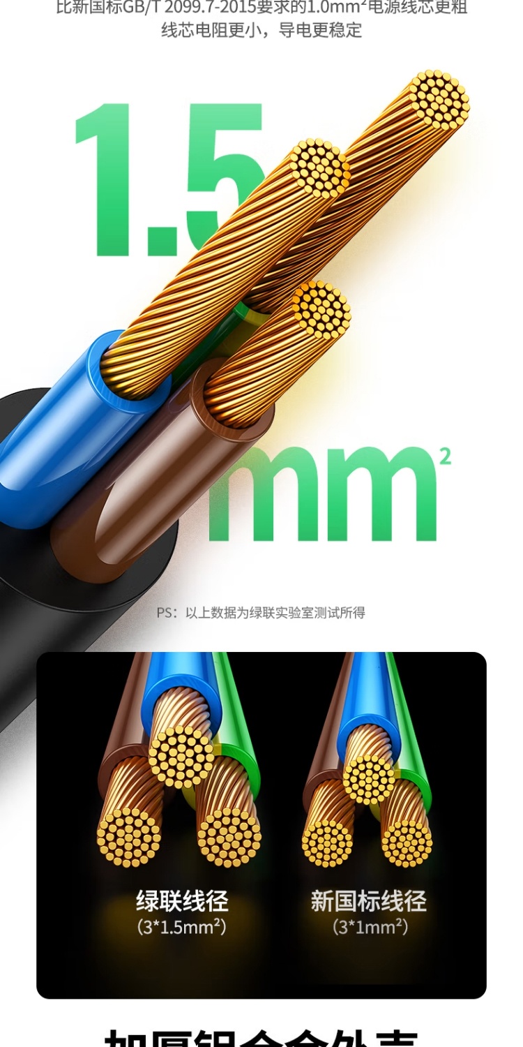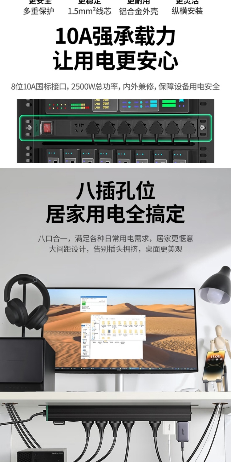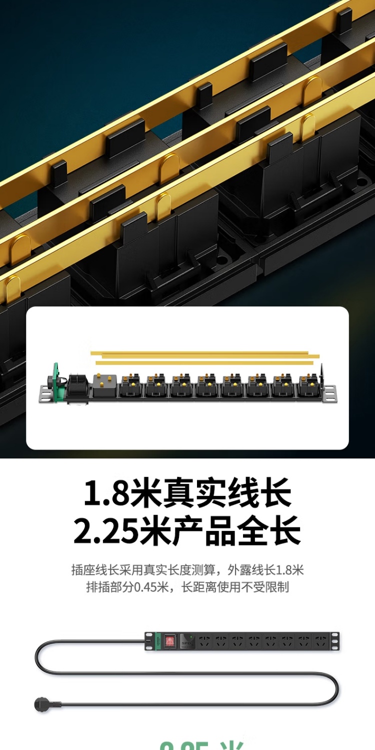 商品名称:绿联 80935 PDU机柜插座 8位10A双断插排新国标机房接线板 总控线长1.8米全长2.25米