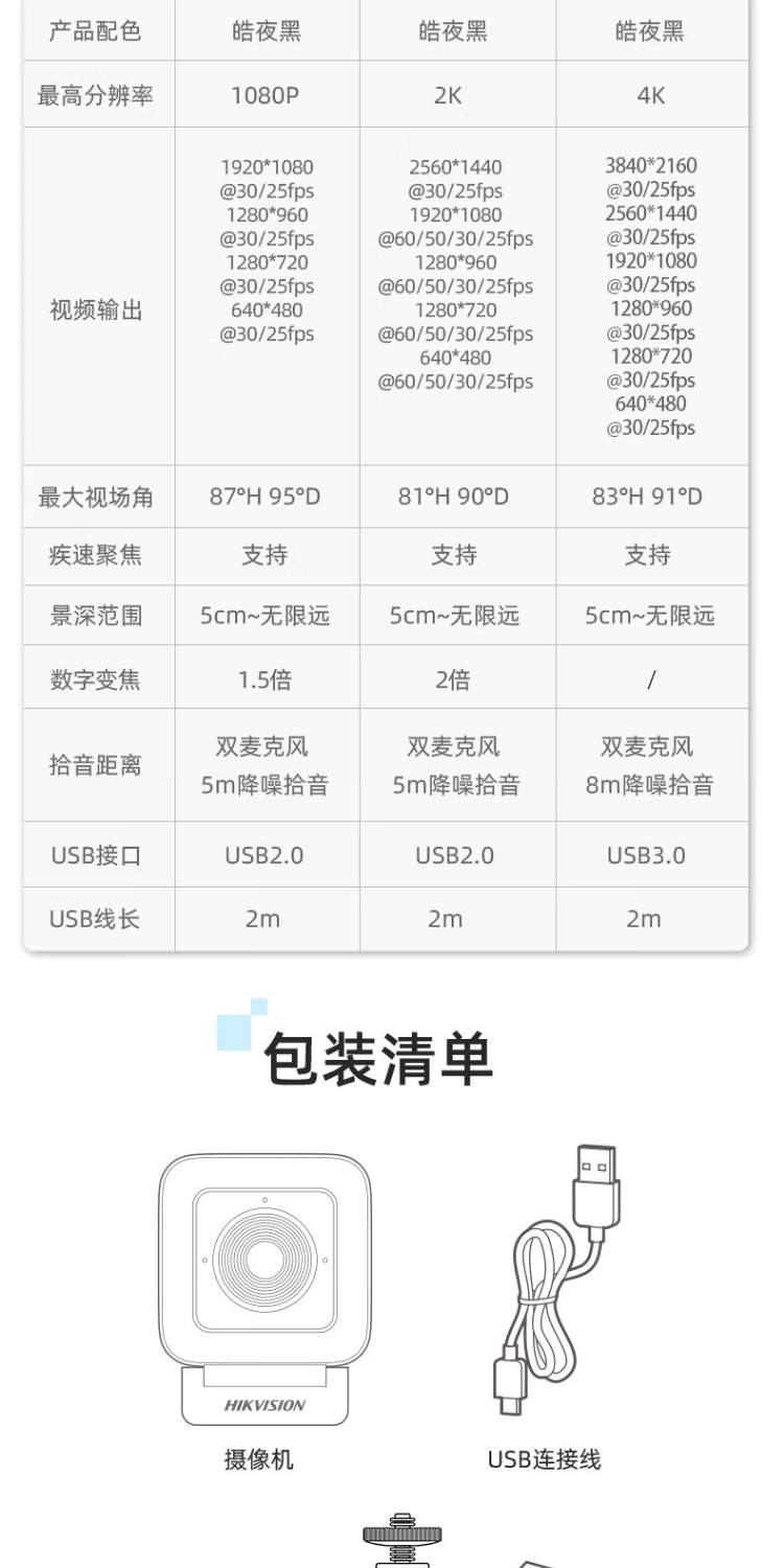 商品名称:海康威视(HIKVISION)DS-U28 电脑摄像头4K超高清USB免驱广角柔光内置麦克风自动对焦网络直播笔记本台式机
